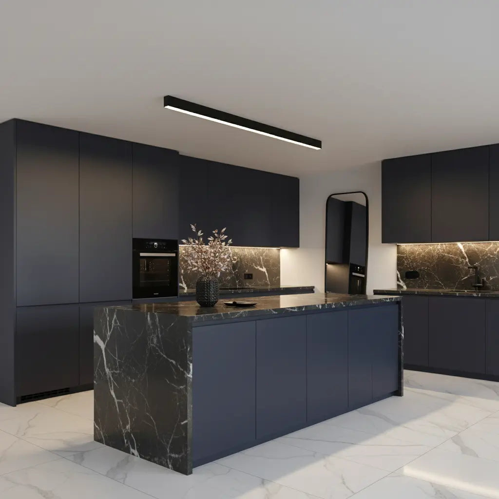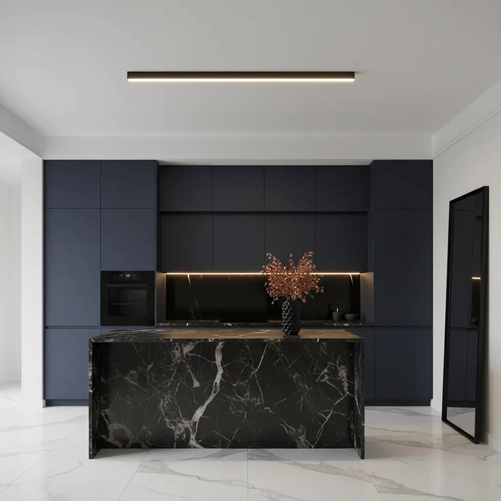 Strakke, zwarte plafondlamp voor een minimalistische en moderne uitstraling in huis.