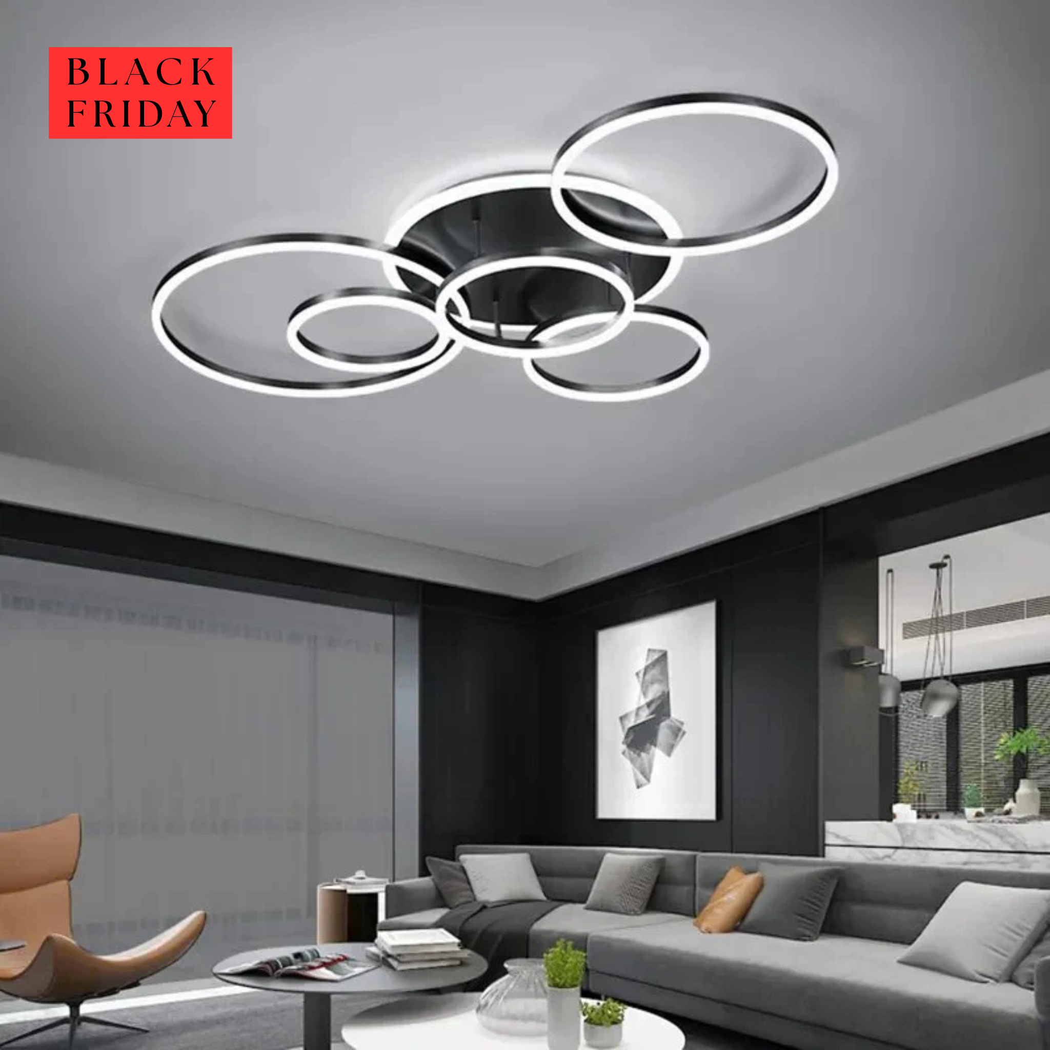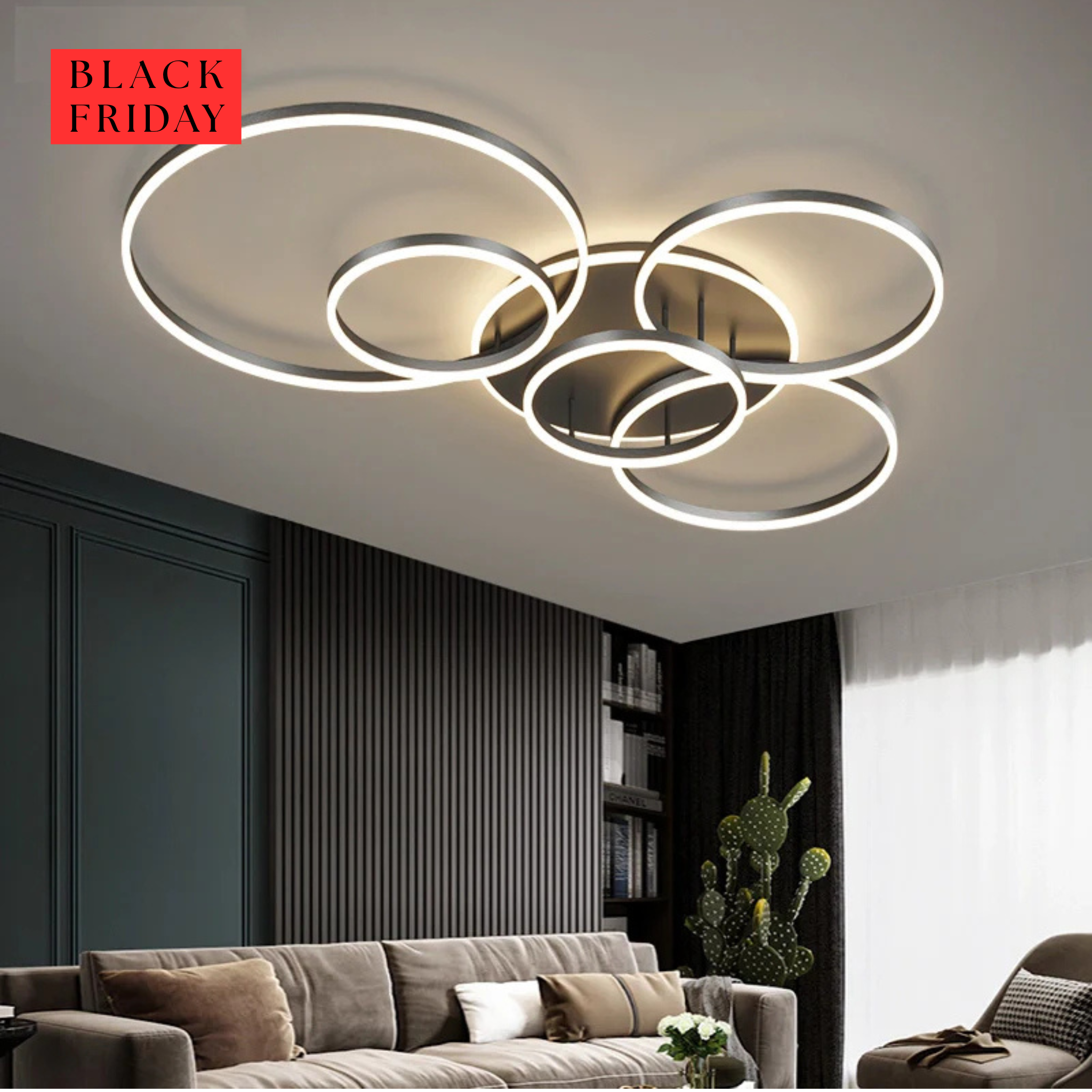 Deze moderne plafondlamp is verkrijgbaar met 5 of 6 dimbare LED-ringen als je de variant met afstandsbediening koopt. Deze moderne plafondlamp is perfect voor het verlichten van grote ruimtes. Door de strak afwerkte zwarte ringen tot wel 30 vierkante meter! Verder kan je gemakkelijk het licht afstellen op een prettige sterkte met de afstandsbediening. Hierdoor kan je meerdere effecten creëren die bij de stijl van jouw huis past. Deze goudkleurige LED plafondlamp met afstandsbediening is perfect voor in huis en geeft een wow-effect aan de ruimte.