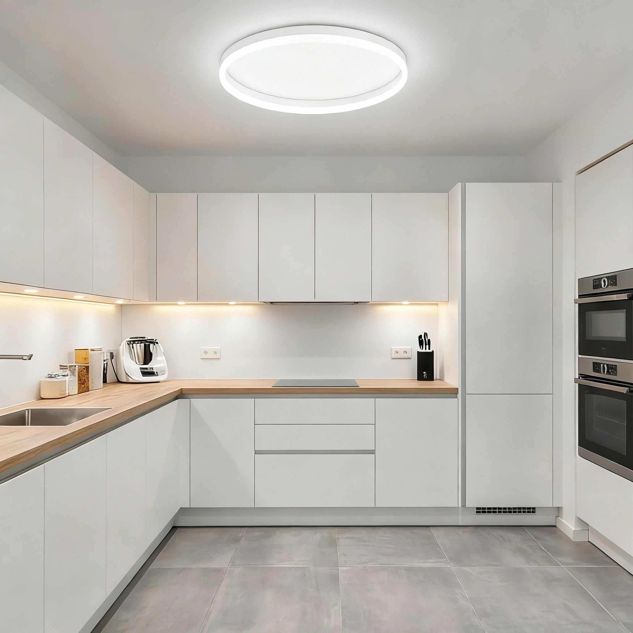 Deze witte plafondlamp in ringvorm biedt een moderne en elegante uitstraling die perfect past in minimalistische en Scandinavische interieurs. Het strakke, ronde ontwerp zorgt voor een gelijkmatige lichtverspreiding, ideaal voor het verlichten van woonkamers, slaapkamers of keukens. De subtiele witte afwerking voegt een fris en eigentijds accent toe aan elke ruimte.
