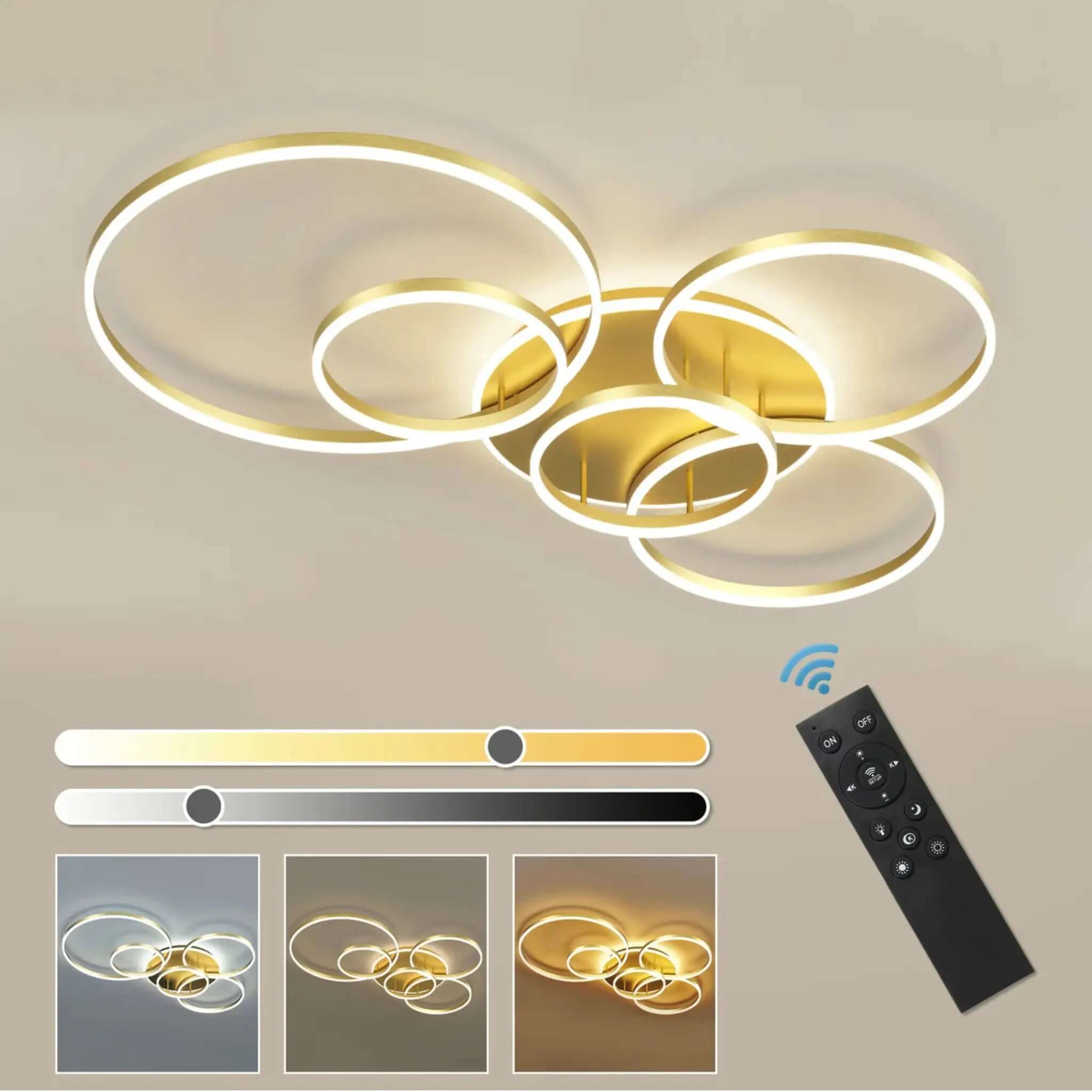 Diese luxuriöse Deckenleuchte ist mit 5 oder 6 dimmbaren LED-Ringen erhältlich. Außerdem wird diese dimmbare LED-Deckenleuchte mit einer Fernbedienung geliefert. Diese moderne Deckenleuchte eignet sich perfekt zur Beleuchtung großer Räume. Aufgrund der dicht verarbeiteten goldfarbenen Ringe bis zu 25 Quadratmeter! Mit der Fernbedienung können Sie das Licht auch ganz einfach auf eine angenehme Stärke einstellen. Auf diese Weise können Sie mehrere Effekte erstellen, die zum Stil Ihres Hauses passen. Diese goldfarbene LED-Deckenleuchte mit Fernbedienung ist perfekt für zu Hause und verleiht dem Raum einen Wow-Effekt.